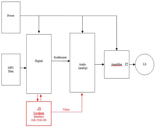 Auch die, von der MPU angeforderten Voice-Fragmente werden durch, im 6800-Assemblercode geschriebene Routinen verarbeitet, die sich im erweiterten Adressraum auf dem Vocalizer-Board befinden. Die Adressen der einzelnen Voice-Fragmente befinden sich ebenfalls innerhalb des durch die MPU adressierbaren Bereiches. Sie sind mit je einer Startadresse und der Anzahl der, ab dieser Startadresse für dieses Fragment zu verarbeitenden Bytes aus den ROMs des Vocalizer-Boards versehen. Die Routine liest die Voice Daten Byte für Byte aus den ROMs und wandelt diese in einen seriellen Datenstrom, den sie zusammen mit einem dazu synchronen Taktsignal wieder zum Vocalizer Board sendet. Dort erfolgt die Demodulation zu einem analogen Sprachsignal. Dieses wird zum AS 2518-56 geleitet und der sich darauf befindlichen Endstufe zugeführt.