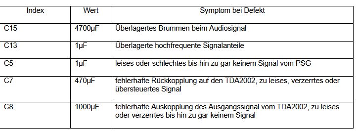 Einige Dokumentationen empfehlen als erste Maßnahme zur Fehlerbehebung von Soundproblemen häufig einen Tausch der Elektrolyt-Kondensatoren. Einige Ersatzteilhändler haben die Kondensatoren daher als Komplettset oder Rebuild-Kit in ihrem Angebot. Aber nicht immer ist der Verursacher einer Fehlfunktion ein gealterter, ausgetrockneter Elektrolytkondensator. Schon gar nicht ist er die Ursache für zeitweise auftretende Sound-Probleme. Entweder er funktioniert oder funktioniert halt nicht. Ein Defekt der hochkapazitiven Kondensatoren ist auch nach mittlerweile über 30 Jahren recht selten. Deren vorsorglicher Tausch ist daher in den meisten Fällen überflüssig. Kondensatoren mit kleiner Kapazität (1µF) sind eher vom Austrocknen betroffen. Auf dem AS 2518-51 und AS 2518-56 gibt es nur einen Elektrolyt-Kondensator, der in der analogen Signalleitung zwischen den Soundausgängen des PSG und der nachgeschalteten Filter- und Verstärkerstufe liegt. Ein Ausfall dieses Elektrolyt-Kondensators und der Kondensatoren C1 und C25 (nur AS 2518-56) ist mit einem Oszilloskop oder Signalverfolger / -injektor recht schnell zu erkennen. Typische Fehlerbilder: Kein Signaldurchgang oder ein verzerrtes und / oder zu leises Signal. Nachfolgende Tabelle stellt die möglichen Fehlerbilder bei defekten Elektrolyt-Kondensatoren dar: