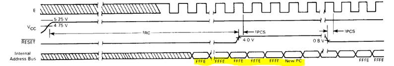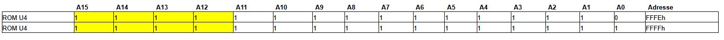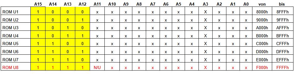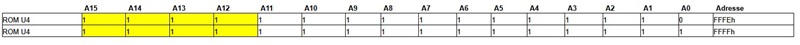 Der Prozessor greift nach dem Einschalten und Ablauf des Reset-Timer auf die Adressen FFFEh und FFFFh zu, an denen sich die Startadresse des abzuarbeitenden Programmes befinden muss. Da die drei oberen Adressleitungen A13 - A15 bei der Adressdekodierung nicht berücksichtigt werden, ist der Adressraum für das ROM quasi 15x (bei einem 2k-ROM) bzw. 7x (bei einem 4k ROM) im theoretisch adressierbaren Bereich von A13 - A15 gespiegelt und deckt somit die beiden notwendigen Startadressen ab. Somit ergibt sich für das ROM ein Gesamtadressraum von 1000h – FFFFh.