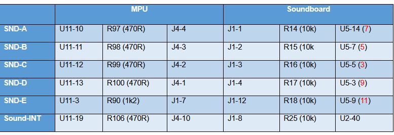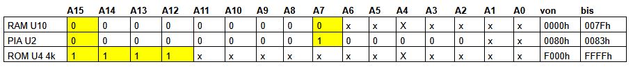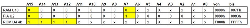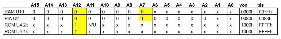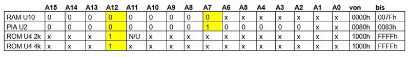 Die nachstehende Tabelle zeigt die Zustände der Adressleitungen während einer Adressierung des RAM, PIA und Sound-ROM. Die jeweilige Auswahl ergibt sich aus den Zuständen der gelb markierten Adressleitungen. Der Programmable Sound Generator AY-3-8910 (U1) ist zu langsam, um direkt mit dem Prozessor zu kommunizieren. Diese Aufgabe übernimmt der PIA U2. Der AY-3-8910 belegt daher keine eigenen Adressen innerhalb des Adressraumes des Prozessors.