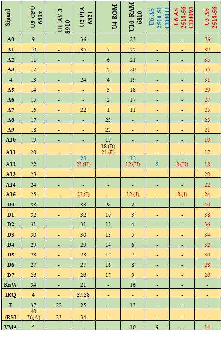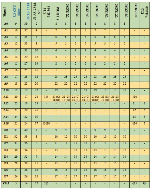 Die nachstehende Tabelle zeigt die Verbindungen der Bus-Signale der CPU auf dem AS 2518-56 und den, über die Steckverbindung J3 (AS 2518-56) und J1 (Vocalizer-Board) direkt mit diesen verbundenen Punkten. Diese Verbindungen können zwischen den Komponenten mit Hilfe eines DMM im Durchgangstest auf Konnektivität oder Berührungen untereinander überprüft werden. Ebenso ist eine Überprüfung im Betrieb mittels eines Logic-Probes hilfreich. An allen in einer Reihe der Tabelle angegebenen Punkten liegt das gleiche Signal bzw. zeitgleich dessen Pegel. Eine Ausnahme bildet U12 auf dem Vocalizer. Da dieser mit je 2 seiner invertierenden Buffer in die A11 und A15 Leitungen geschleift ist, enden A11 und A15 eingangsseitig an U12 und werden von dort als neue Signale A11B und A15B fortgesetzt. Das gleiche gilt für die VMA Leitung, in deren Verlauf ein invertierender Buffer von U12 geschleift ist und /VMA generiert. Die nicht aufgeführten Verbindungen zwischen den IC ohne CPU-Bezug können dem Schaltplan entnommen werden und sollten im Fehlerfall ebenfalls auf Konnektivität bzw. Berührung untereinander geprüft werden. Das gilt auch für die Spannungsversorgung der einzelnen IC. Alle Verbindungen sollten immer direkt von oben am jeweiligen IC-Anschluss geprüft werden, damit die IC-Sockel und deren Lötstellen in der Überprüfung enthalten sind.