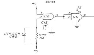 Nach dem Einschalten bzw. Anlegen der Versorgungsspannung wird mit Hilfe der Reset-Schaltung ein definierter und somit stabiler Ausgangszustand für die CPU, den PIA und den PSG erzeugt. Die Reset-Schaltung beim AS 2518-56 besteht aus zwei NAND-Gattern mit Schmitt-Trigger Eingängen (U6). Unmittelbar nach dem Einschalten liegt an Pin 2 von U6 Low-Pegel. Durch die Invertierung führt Pin 3 High-Pegel, welcher durch das 2. Gatter von U6 nochmal invertiert wird und damit die /Reset-Leitung an Pin 4 auf Low-Pegel schaltet, was die genannten Komponenten daran hindert, ihre Funktion aufzunehmen. Der Kondensator C12 wird nun über den Widerstand R20 geladen. Wird der Schwellenwert am Pin2 von U6 erreicht, schaltet Pin 3 auf Low-Pegel und die /Reset-Leitung an Pin 4 wechselt durch die nachfolgende Invertierung auf High-Pegel. Nun kann die CPU mit der Abarbeitung des Programmablaufes beginnen. Der Resetvorgang dauert ca. 150ms. Beim AS 2518-51 werden NAND-Gatter ohne Schmitt-Trigger Eingänge verwendet. Dort gibt es keine definierte Schaltschwelle. Der Pegelwechsel an deren Ausgängen findet statt, wenn die, für CMOS-Gatter definierten Werte für High und Low erreicht wurden.