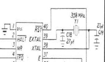 Auszug aus dem Stromlaufplan (Komponenten für die Takterzeugung)Die Taktsignale können mit Hilfe eins Oszilloskops am TP5 sichtbar gemessen werden. Die Frequenz beträgt 895 KHZ, was 1/4 der Frequenz des Schwingquarzes X1 mit 3.58 Mhz entspricht. Steht kein Oszilloskop zur Verfügung, kann mit Hilfe eines Digital-Voltmeters die Spannung am TP5 gemessen werden. Durch das Impuls- / Pausenverhältnisses von 1:1 beträgt die zu erwartende Spannung an TP5 ca. +2.5 VDC. Ist an Pin 37 (E) keine oder eine stark abweichende Spannung messbar, können ein defekter Schwingquarz (Y1), defekte Kondensatoren (C18, C19), eine defekte CPU oder Kontaktprobleme (Sockel, Lötstellen) die Fehlerursache sein.