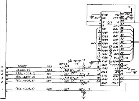 U9 ist ein programmierter 74188A oder alternativ ein 82S23. Die beiden Adressleitungen A11 und A15 der CPU sind am Eingang des Vocalizer-Boards direkt nach J1 jeweils über zwei hintereinander geschaltete, invertierende Buffer von U12 geführt und im weiteren Verlauf als A11B und A15B gekennzeichnet. Das 32x8 PROM besitzt open collector Ausgänge an seinem Datenbus. Aus diesem Grund sind die Pull-Up Widerstände R17 bis R24 verbaut.