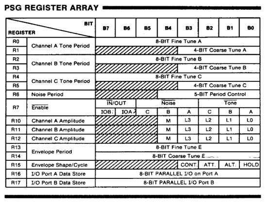 Mit Hilfe des PSG werden softwaregesteuert die für diese Generation typischen Töne, Geräusche und Melodien erzeugt. Wie bereits erwähnt wird der PSG über den PIA U2 von der CPU gesteuert. Die CPU liest und beschreibt über Port A des PIA die 16 genutzten internen Register des PSG.