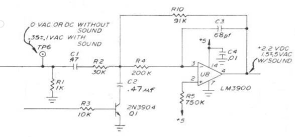 Nehmen wir an, der Kondensator C1 wäre defekt. Dann wäre an Prüfpunkt 2 ein Signal hörbar, an Prüfpunkt 3 wäre kein Signal oder ein im Vergleich zu Prüfpunkt 2 sehr leises oder qualitativ schlechteres Signal zu hören. Es bedarf etwas Erfahrung, das Ergebnis am Prüfpunkt 5, den Ausgang von U8 zu bewerten, da bei der Filterstufe das Ausgangssignal schwächer als das Eingangssignal an Prüfpunkt 4 sein kann und somit kein Fehler wäre. Generell kann man sagen: Ist am Eingang der Stufe ein Signal vorhanden und am Ausgang keins oder ein im Vergleich zum Eingang wesentlich lauteres, ist der LM3900 bzw. dessen Beschaltung sehr verdächtig.