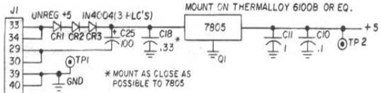 Die Unreg. +5V gelangen von J1 Pin 33 (34) über die Dioden CR1 – CR3 zum Eingang des +5V Spannungsreglers Q1. Die geregelten +5V am Ausgang des Spannungsreglers sind an TP2 gegen TP1 (GND) messbar. Ansonsten sollte als erstes gemessen werden, ob an den Anschlüssen von C18 ca. 10V anliegen. Ist das nicht der Fall, sollten die Dioden CR1 – CR3 geprüft werden. Anode CR1 gegen TP1: ca. +12V, Anode CR2 gegen TP1 ca. 11,3V, Anode CR3 gegen TP1 ca. 10,6V. Je nach Messergebnis lässt sich so der Defekt bestimmen.