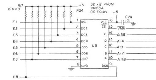Die Adressdekodierung für die acht ROM-Steckplätze U1 bis U8 und der damit verbundenen Erweiterung des ROM-Bereiches auf max. 32kB (incl. U4) wird mittels eines 32x8 Bit PROM mit der internen Part-Nummer E720-44 realisiert. Dessen Programmierung ist so ausgelegt, dass die 16 möglichen Werte, die mit den Adressleitungen A11 – A14 abgebildet werden können, zusammen mit einem High-Pegel auf der Adressleitung A15 jeweils nur eine der acht Datenleitungen (DO1 – DO8 = E1 – E8) auf einen Low-Pegel legen, wenn gleichzeitig der Datenbus mittels eines Low-Pegels auf der /VMA Leitung am /CS Eingang freigegeben ist. Jede Leitung des Datenbusses ist mit dem /Select-Eingang Pin 20 des zugeordneten (EP)ROMs verbunden.