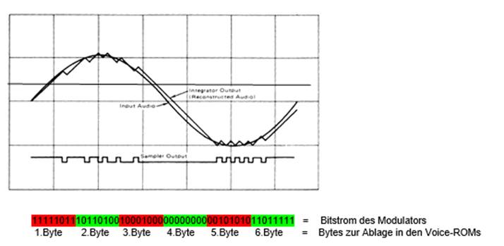 Bei der Delta Modulation wird jeweils nur die Richtung der Signaländerung von einem Pegelwert zum nächsten zwischen zwei Takten eines Clock Signals erfasst. Dazu wird das analoge Signal in gleichmäßigen Abständen abgetastet, gespeichert und mit dem vorherigen Wert verglichen. Ist der zweite Abtastwert größer als der erste, erzeugt der Deltamodulator eine logische ‚1‘, ist der zweite Wert kleiner als der erste, erzeugt er eine logische ‚0‘ und bei einer gleichbleibenden Amplitude einen Wechsel von ‚1‘ nach ‚0' bzw. umgekehrt. Die Rasterung der Y-Achse (Pegel) ist dabei nicht linear. Dadurch erfolgt im unteren Pegelbereich, in dem die meisten Änderungen im Verlauf eines Audiosignales auftreten, eine feinere Abstufung bei der Abtastung als im oberen Pegelbereich mit wenigen auftretenden Peaks. Dieses Prinzip ist der Abtastung für die Analog- / Digitalwandlung nach dem PCM-Verfahren nachempfunden. Das bei der Modulation entstandene, digitale Bitmuster wird in 8 Bit Blöcken (= 1 Byte) in den Voice-ROMs des Vocalizer-Boards zur Spracherzeugung vorgehalten.