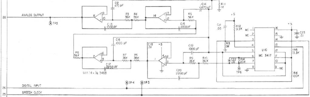 Das vom CVSD erzeugte analoge Ausgangssignal steht an dessen Pin 7 zur weiteren Verarbeitung bereit. Die Umwandlung der Sprachdaten durch den CVSD hat einen unerwünschten Nebeneffekt zur Folge: „Digital Conversion Noise“. Dabei handelt es sich um Oberwellen, die durch die fehlenden weichen Übergänge zwischen den einzelnen Spannungswerten der rekonstruierten Signalkurve entstehen. Um diese Oberwellen zu dämpfen und dadurch ein „kurvigeres“, weniger Oberwellen behaftetes Signal zu erhalten, wird das Ausgangssignal des CVSD zu einem mehrstufigen Tiefpassfilter / Vorverstärker geleitet, die aus dem vierfach Operationsverstärker MC3403 (U11) und dessen Beschaltung aufgebaut ist. Das gefilterte und nun harmonischer klingende Sprachsignal steht am TP3 zur Verfügung und wird über J1 Pin 28 zur Endstufe des AS 2518-56 geleitet.