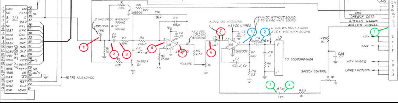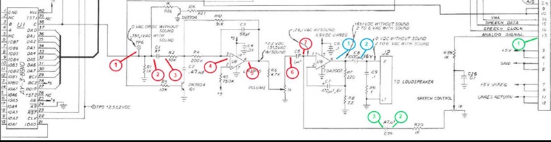 Auf dem Vocalizer-Board wird eine Versorgungsspannung von +5V benötigt. Diese wird mittels eines +5V Spannungsreglers aus den Unreg. +5V (ca. 12V) gewonnen und ist am TP2 gegen TP1 (GND) messbar. Unreg +5V wird über die Pins 33 (34) und Unreg +5V Return über die Pins 29 (30) von J1 vom Soundboard zur Verfügung bereitgestellt. Unreg. +5V Return ist auch auf dem Vocalizer-Board nicht mit der Board-Masse (GND) verbunden, welche über die Pins 39 und 40 zum Vocalizer-Board gelangt. Diese Verbindung ist wiederrum auf dem SDB A3. Ob beide Verbindungen zum SDB bestehen, kann mit einer Widerstandsmessung bzw. Durchgangsprüfung zwischen TP1 und dem – Pol von C25 ermittelt werden.