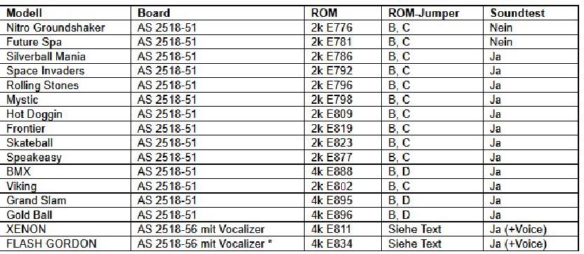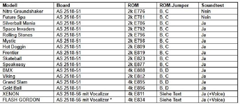 Die Datei für das Sound-ROM auf der gesockelten Position U4 ist modellspezifisch und hat je nach Flippermodell eine Größe von 2kB oder 4kB. Entsprechend können 2kB oder 4kB (EP)ROMs zum Einsatz kommen. Die Größe des verwendeten (EP)ROM ist für eine 2kB Sounddatei allerdings nicht auf ein 2kB (EP)ROM beschränkt. Es können auch Typen mit einem Speichervolumen von 4kB zum Einsatz kommen, wobei sich die 2kB Daten in der oberen Hälfte eines 4kB (EP)ROM befinden müssen. Bei einem AS 2518-56 im FLASH GORDON und XENON werden ebenfalls 4kB unterstützt und dort auch genutzt. Der verwendete (EP)ROM-Typ wird mittels Drahtbrücken (Jumper) eingestellt.
