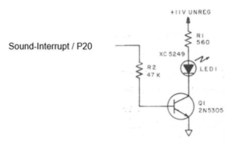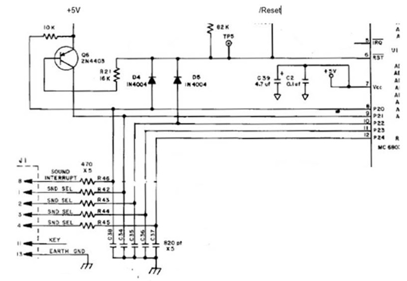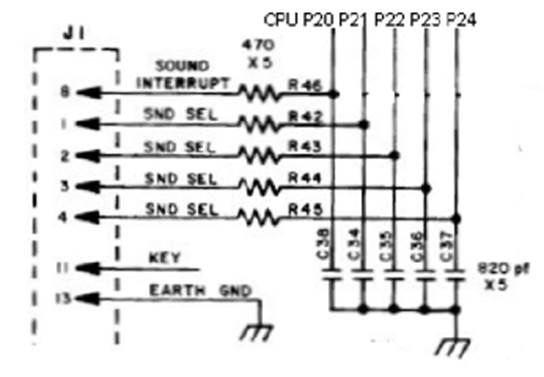 Die an J1 ankommenden Sound Select Signale und der Sound-Interrupt werden über einen 470Ohm Widerstand an die Portleitungen P20 bis P24 der CPU geleitet und dort verarbeitet.