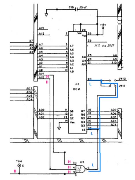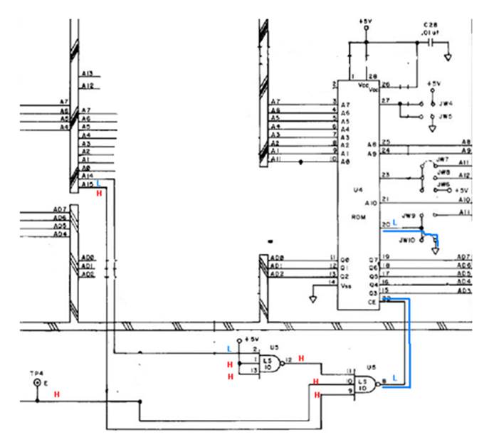 Die Adressdekodierung für ein 2732 EPROM in Position U4 funktioniert auf die gleiche Weise. Die E-Leitung führt High-Pegel und gelangt auf den Eingang eines NAND-Gatters. A15 führt High-Pegel und gelangt an einen weiteren Eingang des NAND-Gatters. A14 gelangt an den dritten Eingang des NAND-Gatters, nachdem dessen Pegel über ein separates NAND-Gatter invertiert wurde. Somit muss A14 Low-Pegel führen, damit /CE von U4 auf Low gelegt werden kann. /OE von U4 wird über JW10 fest mit GND (= Low-Pegel verbunden) und ist somit unabhängig von einer Freigabe über U5.