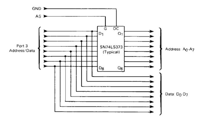 Der Prozessor legt die oberen 8 Bit der 16 Bit breiten Adresse an seine Adressleitungen A8 – A15 und die unteren 8 Bit an die Portleitungen P30 – P37. Diese sind mit den Eingängen D1 – D8 des Octal Latch 74LS373 (U2) verbunden. Legt er nun seine AS Leitung auf High Potential, erfolgt die Übernahme der Adressinformation von P30 – P37 in das Latch. Dieses speichert die Information und stellt sie an dessen Ausgang als A0 – A7 zur Verfügung, bis eine neue Adressinformation durch einen erneuten L/H-Wechsel auf AS übernommen wird. Nun sind P30 – P37 wieder frei und werden direkt im Anschluss für den Datenbus D0 – D7 verwendet.