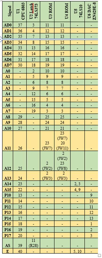Die nicht aufgeführten Verbindungen zwischen den IC ohne CPU-Bezug können dem Schaltplan entnommen werden und sollten im Fehlerfall ebenfalls auf Konnektivität bzw. Berührung untereinander geprüft werden. Das gilt auch für die Spannungsversorgung der einzelnen IC sowie Pins, die über Jumper mit +5V oder GND verbunden werden können.