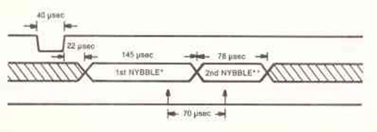 Damit die MPU das CHEAP SQUEAK ansprechen kann um notwendige Steuerinformationen zu übermitteln sowie die zu generierenden Soundsignale anzufordern, generiert sie über die Sound Interrupt Leitung (J1 Pin 8) für die Dauer von 40µs einen Low-Pegel. Es stehen 4 Sound Select Leitungen an J1 (Pins 1,2,3,4) zur Verfügung. Darüber wären bei einer direkten Adressierung nur 16 verschiedene Soundadressen resp. Soundsignale möglich. Um eine erweiterte Adressierung und damit mehr Soundsignale generieren zu können, wird die Soundadresse in der Form von 2 halben Bytes (= 1 Nibble = 4 Bit) innerhalb eines fest definierten Zeitfensters übertragen, was einer Auswahlmöglichkeit zwischen maximal 256 möglichen Steuer- und Soundkombinationen entspricht. Die CPU liest diese 2 Nibble entsprechend des unten dargestellten Timing-Diagrammes zur weiteren Verarbeitung ein.