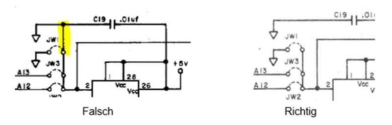 Der folgende Ausschnitt aus dem Schaltplan kann so wie dargestellt nicht funktionieren. Durch die Jumper JW1, JW2 und JW3 soll je nach Bedarf der Pin 2 von beiden EPROM-Sockeln entweder mit GND oder mit A12 bzw. A13 verbunden werden können. Die gelb markierte Verbindung würde das verhindern und ist daher auf dem Platinen Layout nicht vorhanden.
