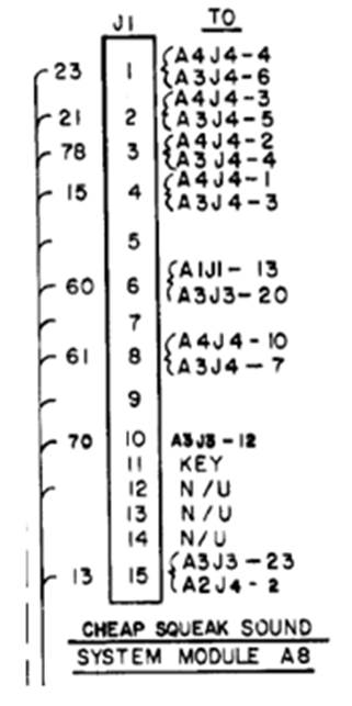 Der Verdrahtungsplan der Geräte, in dem ein CHEAP SQUEAK zum Einsatz kommt, zeigt jeweils, dass die Signalleitungen von der MPU A4 J4 Pins 1,2,3,4,10 zum CHEAP SQUEAK A14 J1 Pins 1,2,3,4,8 und von dort weiter zum SDB A3 J4 Pins 6,5,4,3,7 verlaufen. Wichtig in diesem Zusammenhang ist zu wissen, dass bei einem Fehler an einer oder mehreren Leitungen zwischen MPU und CHEAP SQUEAK nicht nur die Adressierung des CHEAP SQUEAK, sondern gleichzeitig auch die Spulenadressierung fehlerhaft wäre.