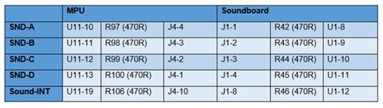 Für die Sound-Select Leitungen A – D und die Sound-Interrupt Leitung ergibt sich bedingt durch die beiden Widerstände ein Streckenwiderstand von jeweils 940 Ohm.