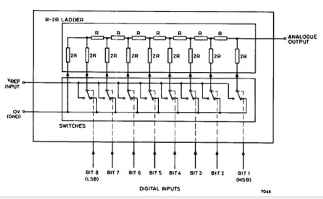 Das R/2R-Netzwerk des DAC besteht aus Widerständen mit zwei unterschiedlichen Werten: Die einzelnen Eingangsbits, hier schematisch als Schalter dargestellt, liegen je nach Schaltungszustand entweder auf Masse oder an der Referenzspannung und speisen einen elektrischen Strom über doppelt so große Widerstände (2R) ein, wie sie im horizontalen Teil (R) des Netzwerks bestehen. Jedes Bit trägt so seinen spezifischen Teil zur resultierenden Ausgangsspannung bei. Das höchstwertige Bit ist für 50 %, das folgende für 25 % das nächste für 12,5 % usw. der Referenzspannung verantwortlich. In Summe ergibt sich eine analoge Spannungsstufe, die dem Wert des digitalen Eingangswertes entspricht. Im Beispiel des ZN429E-8 sind das 256 verschiedene Werte (0-255).
