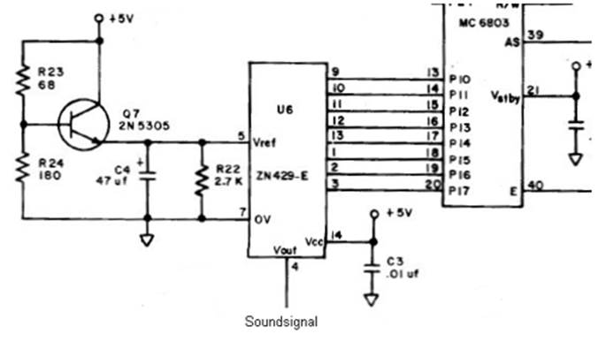 Die Soundgenerierung wird mit Hilfe des Digital/Analog-Wandlers (DAC) ZN429E-8 (U6) realisiert, der aus einem R/2R Netzwerk besteht. Da der DAC nicht im direkt adressierbaren Bereich der CPU liegt sind seine 8 digitalen Eingangsleitungen mit den I/O Ports P10 – P17 der CPU verbunden. Die CPU liest die notwendigen Bytes aus dem Sound-ROM, verarbeitet die darin enthaltenen Informationen zu den auszugebenden Werten und legt diese anschließend an die Portleitungen P10 – P17. Somit sind in den ROMs keine gesampelten und digitalisierten Werte hinterlegt, was den Rahmen deren Speichervolumen sprengen würde. Der DAC wandelt jedes von der CPU generierte Byte in einen, der digitalen Information entsprechenden Spannungswert.