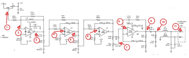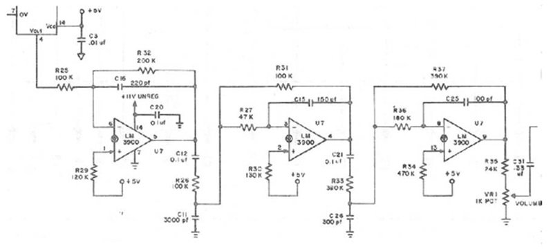 Die Umwandlung der Sounddaten durch den DAC hat einen unerwünschten Nebeneffekt zur Folge: „Digital Conversion Noise“. Dabei handelt es sich um Oberwellen, die durch die fehlenden weichen Übergänge zwischen den einzelnen Spannungswerten der generierten Signalkurve entstehen. Um diese Oberwellen zu dämpfen und dadurch ein „kurvigeres“, weniger mit Oberwellen behaftetes Signal zu erhalten, wird das Ausgangssignal des DAC zu einem mehrstufigen Tiefpassfilter / Vorverstärker geleitet, die aus drei der vier Operationsverstärker des LM3900 (U7) und deren Beschaltung aufgebaut ist.
