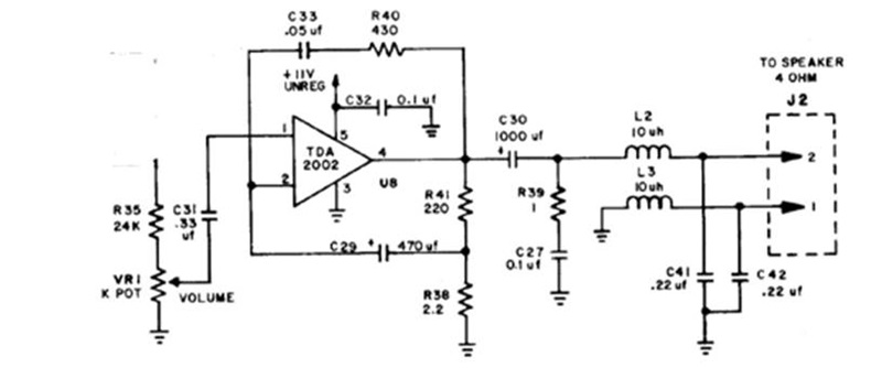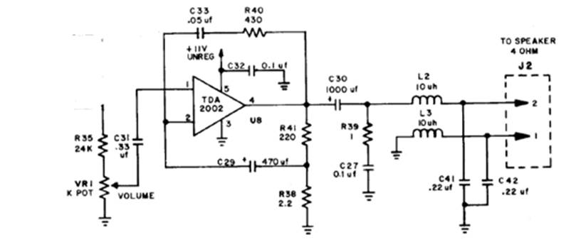 Dieser befindet sich im mittleren rechten Bereich des CHEAP SQUEAK auf dem kleineren der beiden Kühlkörper. Das aufbereitete Audiosignal gelangt über R35, den Lautstärketrimmer VR1 und C31 an den nicht invertierenden Eingang von U8 (TDA2002), Das vom TDA2002 verstärkte Soundsignal wird über den Spannungsteiler R41/R38 und über C29 auf den invertierenden Eingang von U8 zurückgekoppelt und gleichzeitig über C30 und L2 an J2 Pin 2 in Verbindung mit J2 Pin 1 zum Anschluss des 4 Ohm Lautsprechers bereitgestellt. C27 und R39 bilden ein so genanntes Boucherot-Glied oder Snubber-Glied zur Verhinderung von wilden HF-Schwingungen am Ausgang von U8. L2 / C41 und L3 / C42 bilden Tiefpassfilter und blocken ebenfalls hochfrequente Störanteile Richtung Lautstärkepoti in der Kassentür bzw. Lautsprecher.