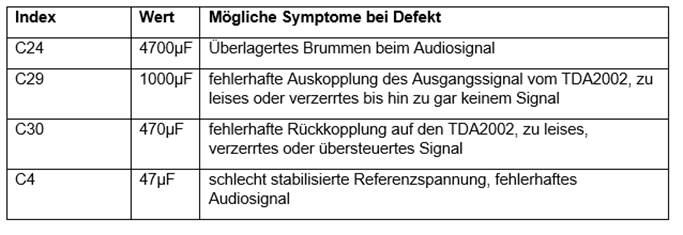 Die nachfolgende Tabelle enthält eine Auflistung der Elkos: