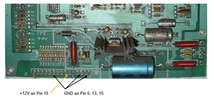 Sind weder die 11 V unreg. noch die +5V an den TP 1 und TP 2 messbar, ist zu prüfen, ob die 12V unreg. zwischen den Pins 10 und 15 an J1 anliegt. Ist das der Fall, ist L1, D6, D7 und D8 zu prüfen. Liegt 11V an TP1 und keine +5V an TP2, ist der MC7805 zu prüfen.