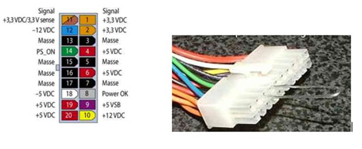 Um das CHEAP SQUEAK auf der Werkbank zu booten, wird eine Gleichspannung von +12 Volt benötigt. Die stellt z.B. ein PC-Netzteil bereit. Die +12V liegen an dem gelben Draht auf Pin 10 des 20-poligen Steckers des PC-Netzteils an. Dieser wird mit J1 Pin 10 des CHEAP SQUEAK verbunden. GND liegt an den schwarzen Drähten des 20-poligen Steckers. Einer dieser Drähte wird mit J1 Pin 6, 13 und 15 des CHEAP SQUEAK verbunden. Damit das Netzteil nach dem Anlegen der Netzspannung die Ausgangsspannungen liefert, muss es über die grüne Steuerleitung (PS_ON) Steckers eingeschaltet werden, in dem diese Leitung mit Masse (schwarz) verbunden wird. Dazu müssten bei einem 20 poligen Mainboard-Stecker Pin 14 mit z.B. Pin 15 gebrückt werden. Es sollte selbstverständlich sein, beide Spannungen vor dem Verbinden mit dem CHEAP SQUEAK zu prüfen. Ein fehlerhaftes Netzteil oder eine, an den falschen Punkten des Steckers abgegriffene oder am CHEAP SQUEAK falsch angelegte Spannung können zu einem Schaden am CHEAP SQUEAK führen.