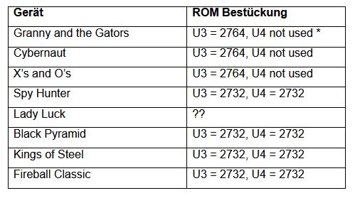 Die Code- / Sound-ROMs auf den gesockelten Positionen U3 und U4 sind gerätespezifisch. Die Adressierung für die jeweiligen EPROM-Typen und Größen (4kB oder 8kB) wird über Drahtbrücken (Jumper) eingestellt.