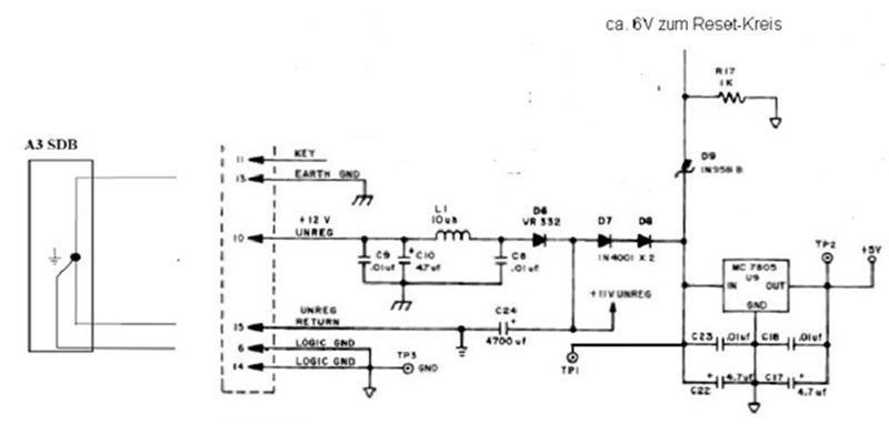 - Fehler in der Reset-Schaltung. Nach dem Einschalten liegt an TP5 Low-Pegel. Nach einer Zeit von ca. 300 ms wechselt der Pegel an TP 5 auf High und gibt somit die CPU frei. Liegt nach dem Einschalten bereits ständig ein High-Pegel ohne vorangegangenem Wechsel nach Low oder ständig ein Low-Pegel ohne Wechsel auf High an, ist die Reset-Schaltung zu prüfen.