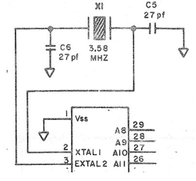 Die CPU benötigt zur Abarbeitung des Programmes einen Takt. Dieser wird durch einen 3.58 MHz Schwingquarz generiert, der an den Pins 2 und 3 angeschlossen ist und kann dort gemessen werden. Intern werden diese 3.58 Mhz durch 4 geteilt, so dass der eigentliche Systemtakt zum Abarbeiten der Befehle 895 kHz beträgt. Dieser Takt wird an Pin 40 (E) zur Taktung der externen Peripherie bereitgestellt und kann dort oder an TP4 gemessen werden. Fehlt dieser Takt, findet auch keinerlei Signalwechsel auf den Adress- und Datenleitungen statt.