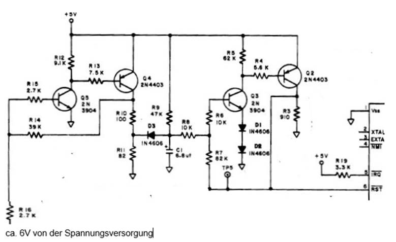 Direkt nach dem Einschalten ist der Kondensator C1 noch entladen. Dadurch sperrt Q3 und Q2 schaltet GND (= Low) auf die /Reset-Leitung. Wird C1 über R9 geladen, folgt Q3 dessen Ladekurve bis die Ladespannung ca. 2.5 V erreicht hat. Q2 schaltet und legt um diese Zeit verzögert die /Resetleitung auf +5V (= High). Gleichzeitig wird nach dem Einschalten Q5 angesteuert, der Q4 durchschaltet. Dadurch stellt sich an der Kathode von D3 eine Spannung von etwa 2.5 V ein, was verhindert, dass sich C1 über D3 und R11 entladen kann. Wird die Versorgungsspannung unterbrochen, entlädt sich C1 über diesen Weg, da Q4 nicht mehr durchgesteuert wird. Somit ist ein sauberer Reset auch nach sehr kurzen Spannungsunterbrechungen gewährleistet.